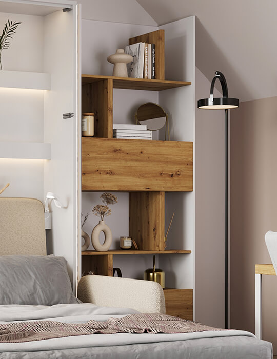 המערכת של הארונות, המדפים והארונות התלויים לא רק מאפשרת לך לאחסן את חפציך בצורה חופשית, אלא גם מסדרת ומארגנת את המרחב סביב המיטה באופן מלא. המדפים מעניקים חופש מלא להצגת אביזרים, ספרים או צמחים, ומוסיפים קלילות ואלגנטיות לעיצוב הפנים. מגוון אפשרויות הצבעים מאפשר לשלב את הרהיטים בצורה מושלמת עם עיצוב הפנים שלך.