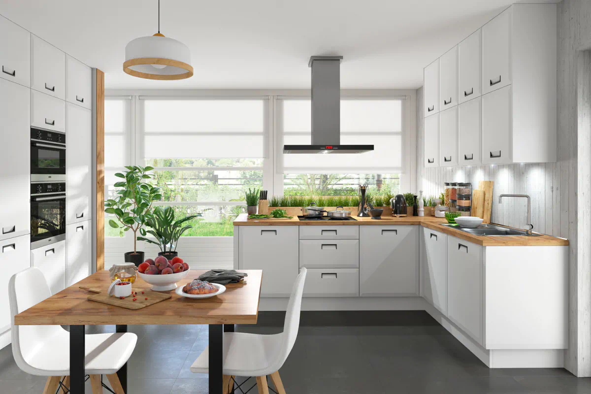 מטבח מודרני שמעוצב במחשבה על פונקציונליות ואסתטיקה, שילוב של ארונות מטבח לבנים עם עץ וידיות שחוריות מייצרים ניגודיות ייחודית ואלגנטית. מטבח בהתאמה אישית מאפשר לכם לבחור את סידור הארונות ממגוון סוגי ארונות, חזיתות הארונות ממגוון צבעים, משטחי עבודה ופתרונות אחסון מתקדמים למכשירי חשמל ועוד. התאמה אישית של המטבח מנצלת