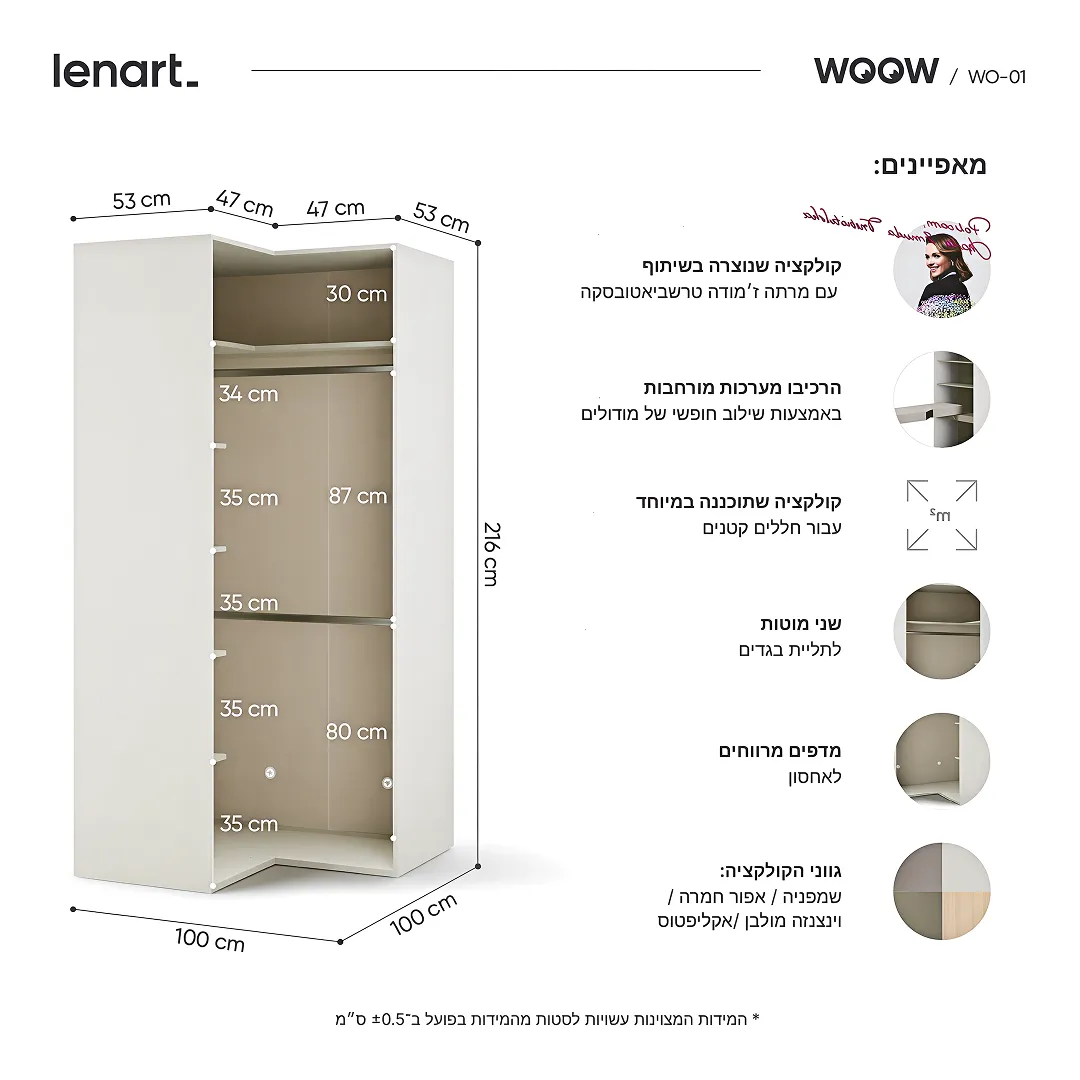 ארון פינתי לחדר נוער בעיצוב מודרני, עם חלוקה פנימית חכמה למדפים ומוטות תלייה. פתרון אידאלי לניצול פינות ולחיסכון במקום, המשתלב בקלות עם רהיטים נוספים מסדרת WOOW.