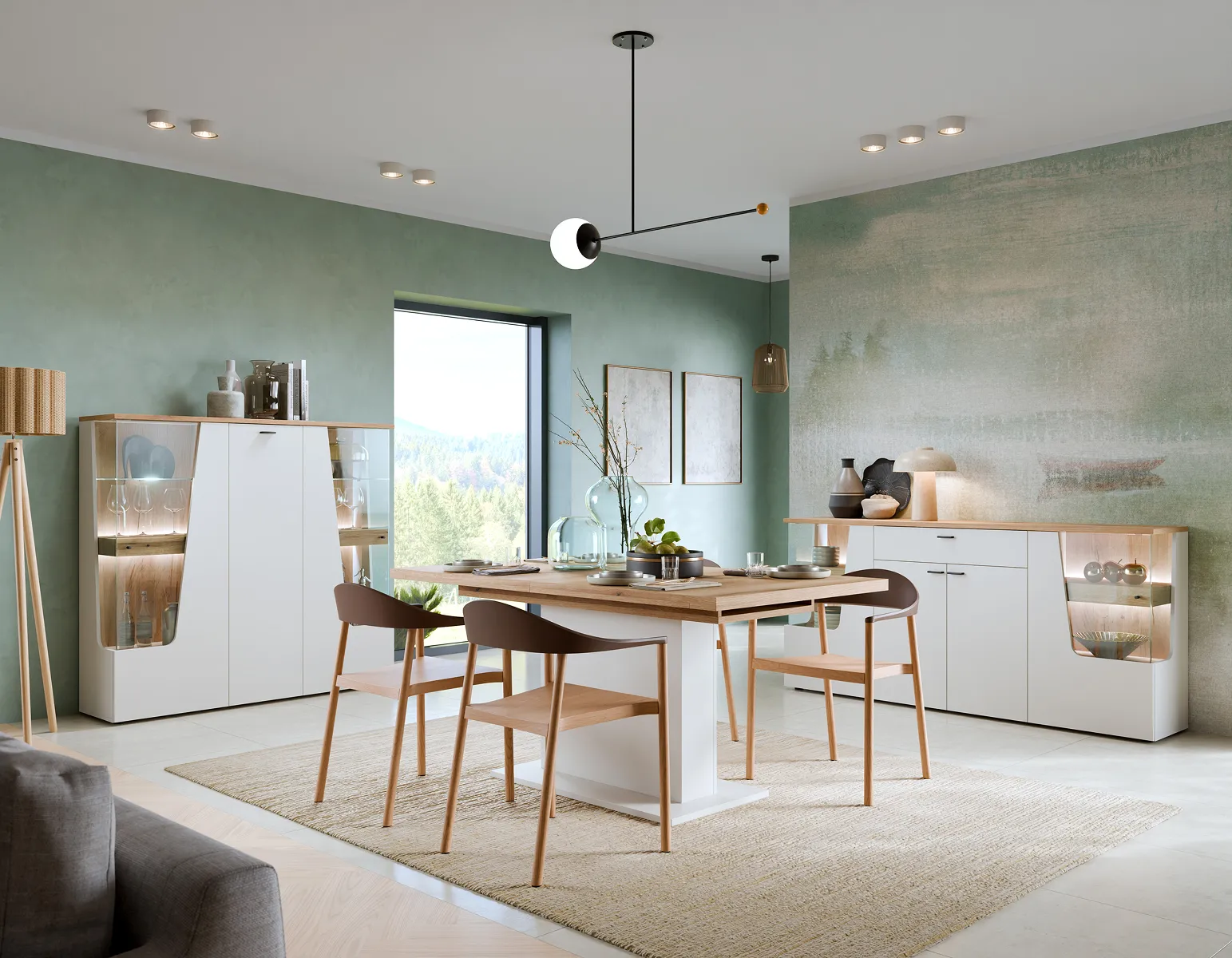ויטרינה קומפקטית בעיצוב מודרני מהסדרה CUT OUT, משלבת מראה חם של עץ אלון טבעי עם גוף בגוון קשמיר בהיר. צד ימין כולל דופן זכוכית עם שני מדפי תצוגה ותאורת LED פנימית – מושלמים להצגת פריטי נוי, כלי זכוכית או קישוטים מוארים.