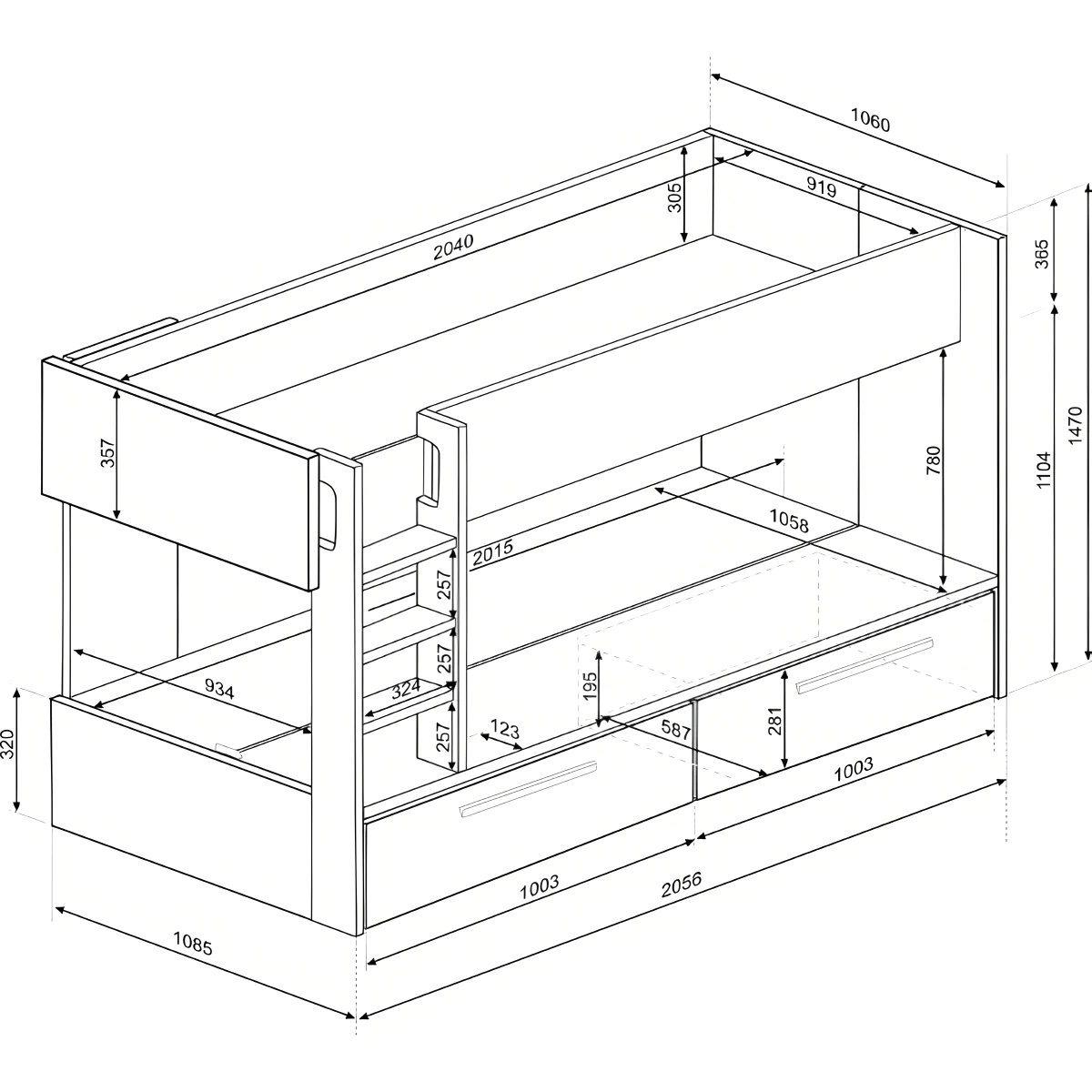 המיטה כוללת שתי מגירות אחסון בהן ניתן לאחסן חפצים רבים (צעצועים, מצעים, בובות וכו'). כדי למנוע תאונות, הסולם מצויד בידיות מעוקלות ורצועות נגד החלקה.