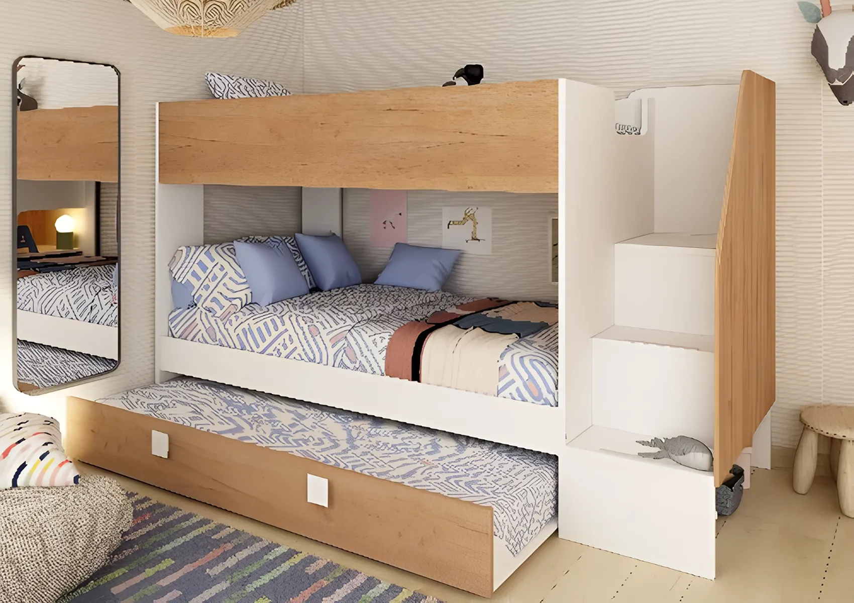 מיוצרת על ידי אחד ממפעלי הרהיטים המובילים בספרד, המיטה תוכננה לשלב פונקציונליות, עמידות ושקט נפשי. הסולם ניתן להתקנה בצד ימין או שמאל, בהתאם למבנה החדר. מיטת החבר הנשלפת נעה בקלות על גלגלים ומתאימה לשימוש יומיומי או כאופציה נוספת לאורחים.