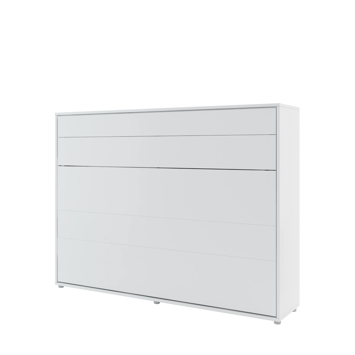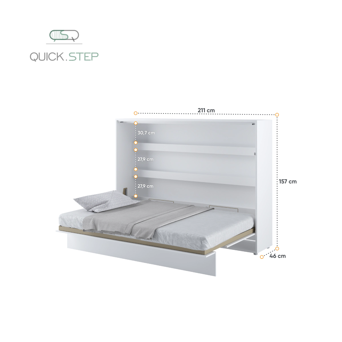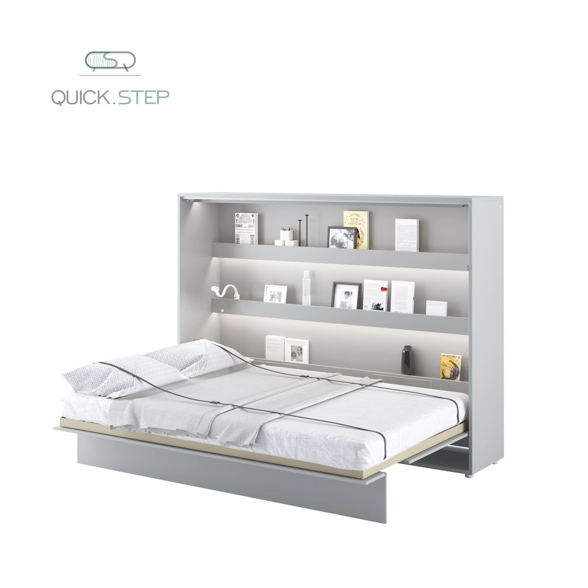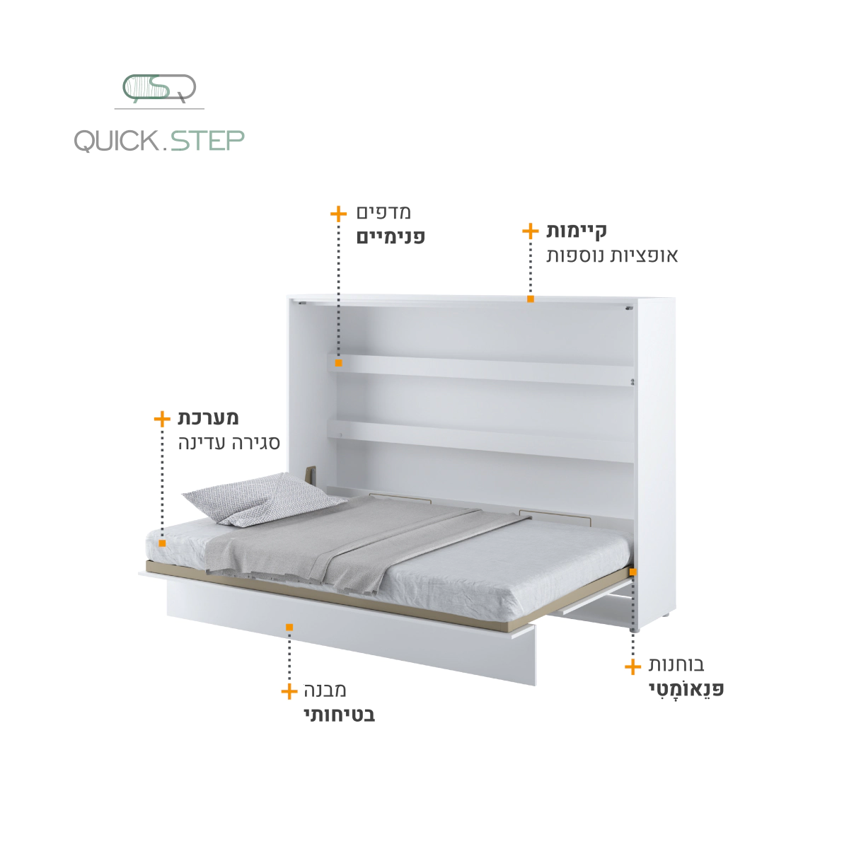 מיטה זוגית מתקפלת לקיר בצורה אופקית, נסתרת בתוך שידה עם מדפים פנימיים לאחסון. מערכת שינה מעוצבת קומפקטית וחכמה לדירות קטנות.