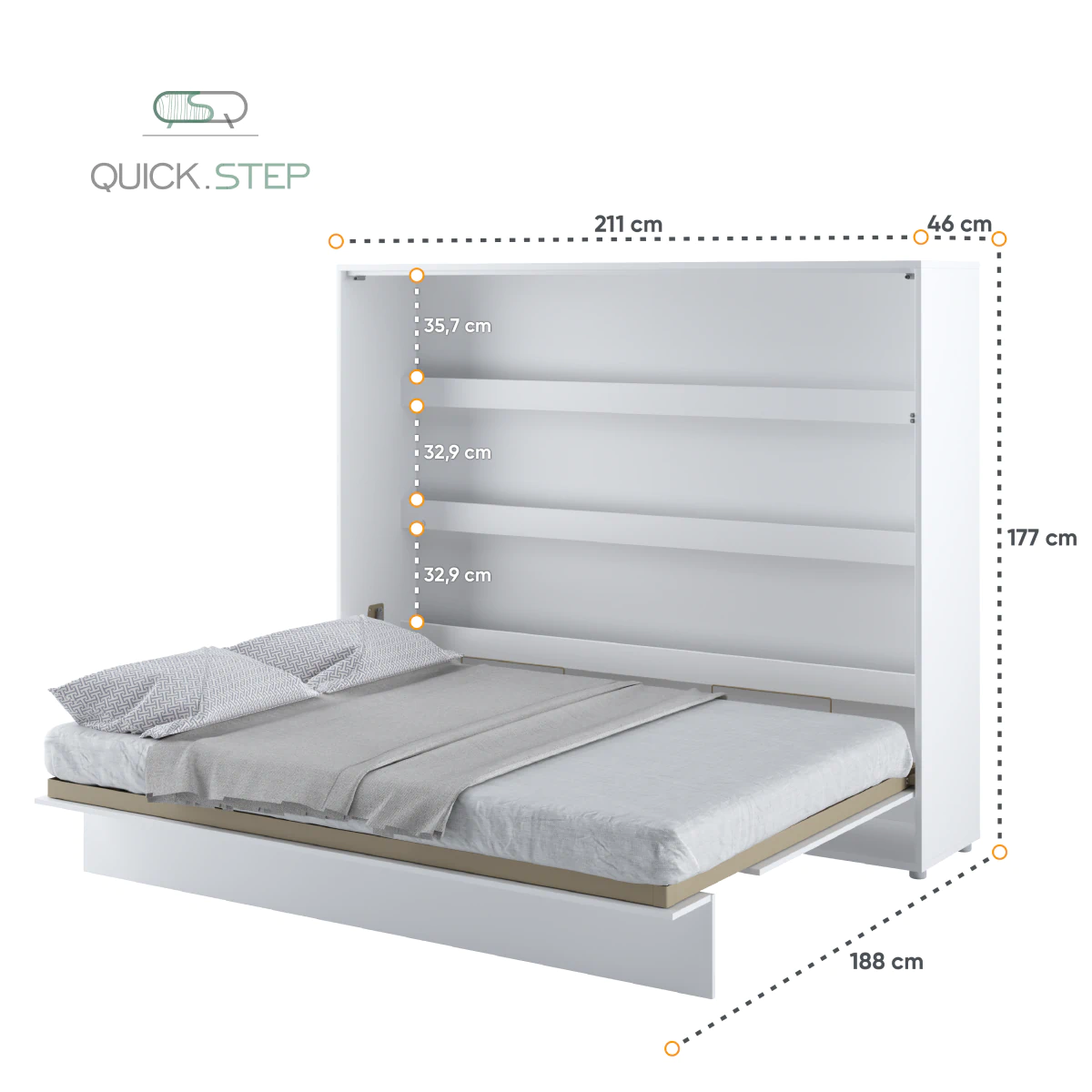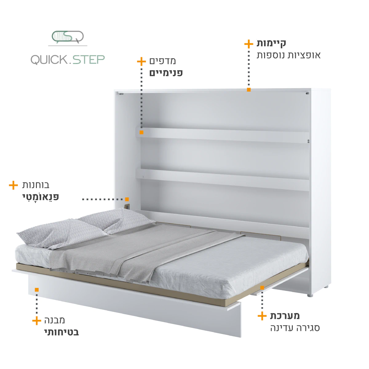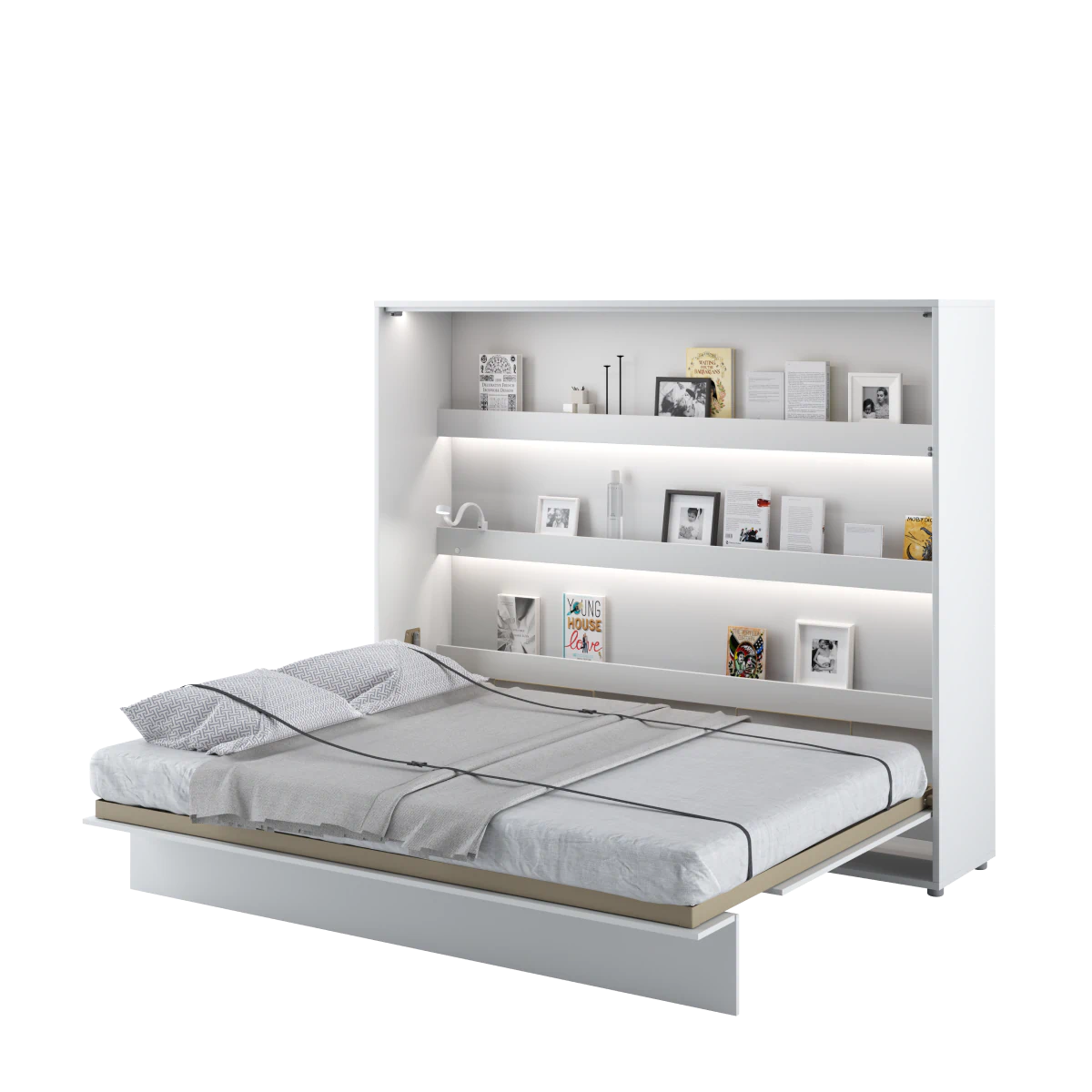 מיטה זוגית אנכית נסתרת בארון קיר עם מדפים פנימיים לאחסון. מיטת קיר מתקפלת – פתרון מושלם המשלב פונקציונאליות, נוחות ועיצוב במוצר אחד.