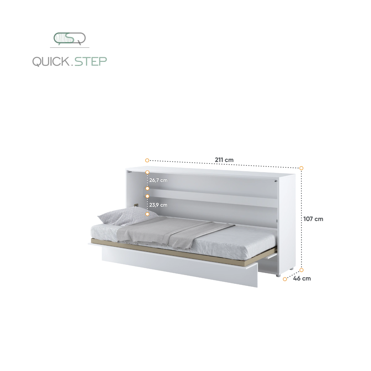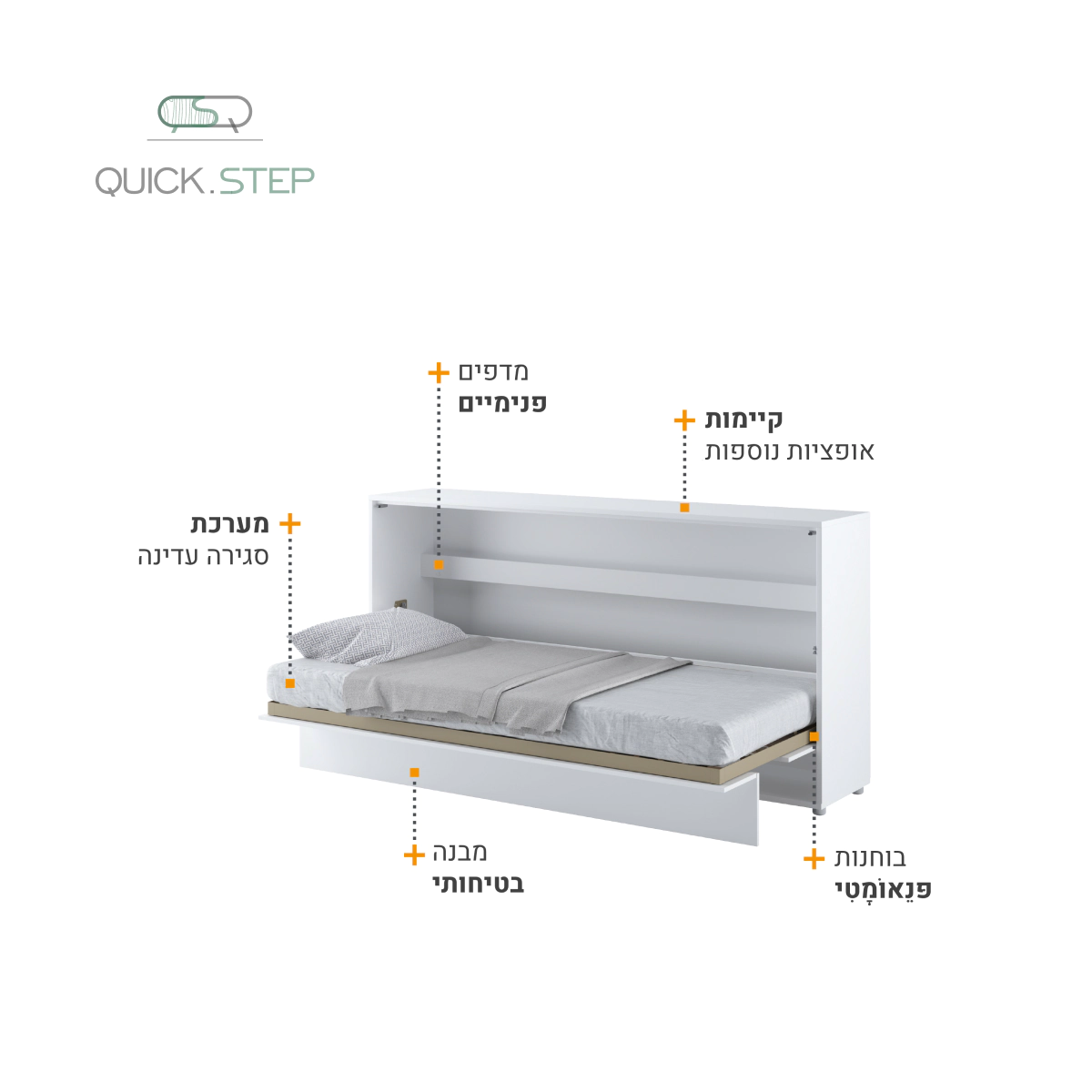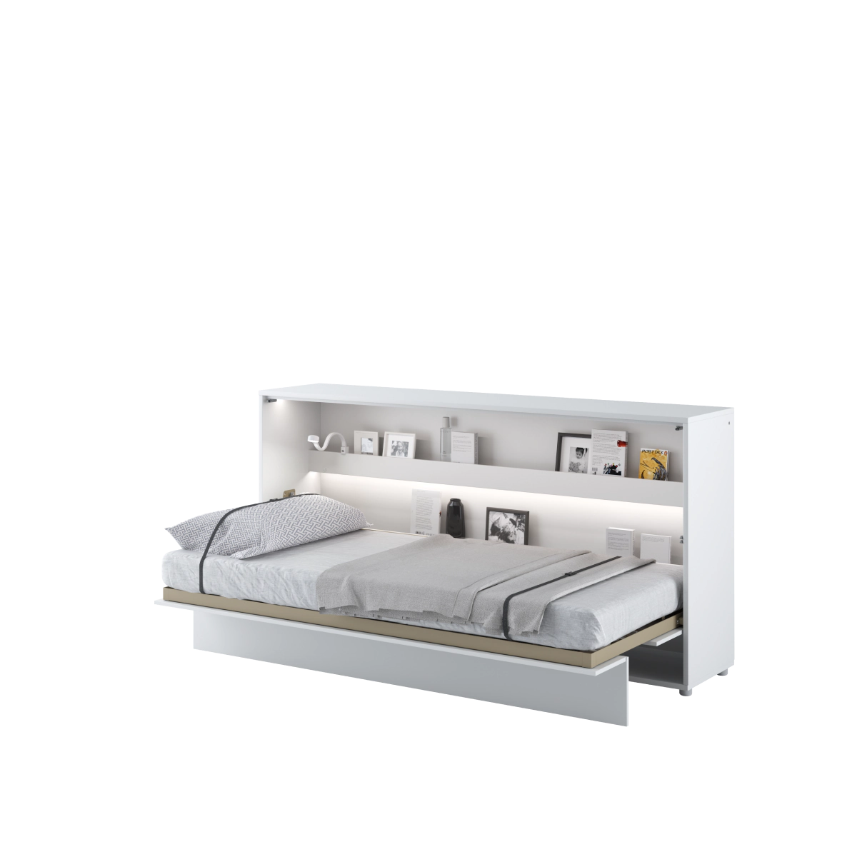 מיטת יחיד אופקיות מתקפלת לקיר, נסתרת בתוך שידה עם מדפים פנימיים לאחסון. מערכת שינה קומפקטית לדירות קטנות עבור חדרי ילדים, נוער, חדר אורחים או מגורי סטודנטים.