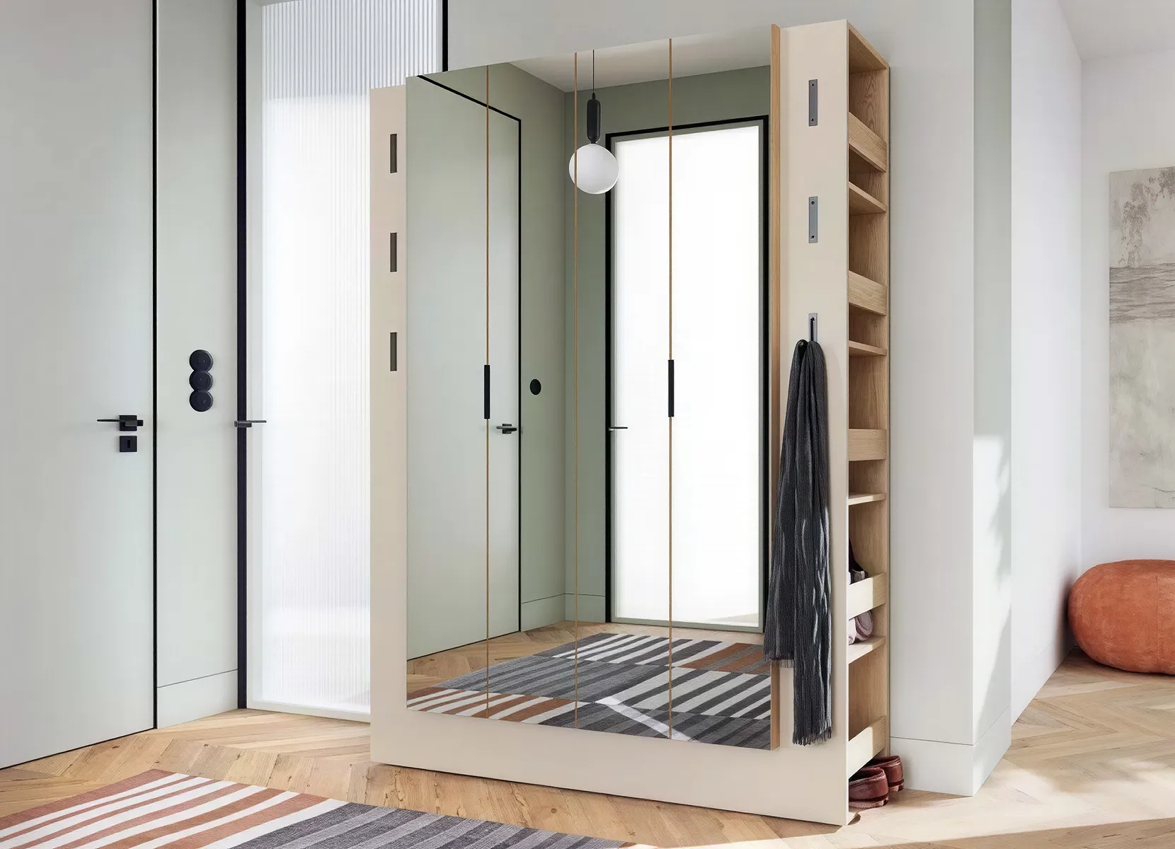 בנוסף, בגוון הקשמיר של החזית שובצו שלושה מתלים מתכתיים מסוג push-pull – לחיצה קלה אחת תשלוף אותם לתליית מפתחות, תיק או צעיף, ולאחר השימוש – הפנל חוזר לקו ישר ונקי, בלי להפר את העיצוב המינימליסטי.