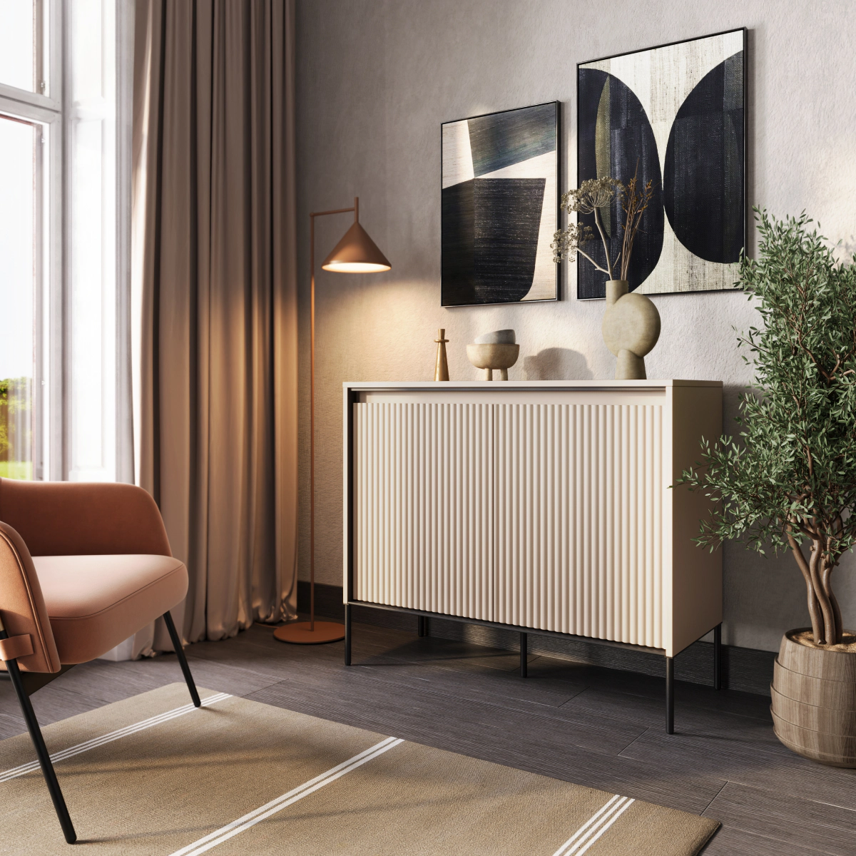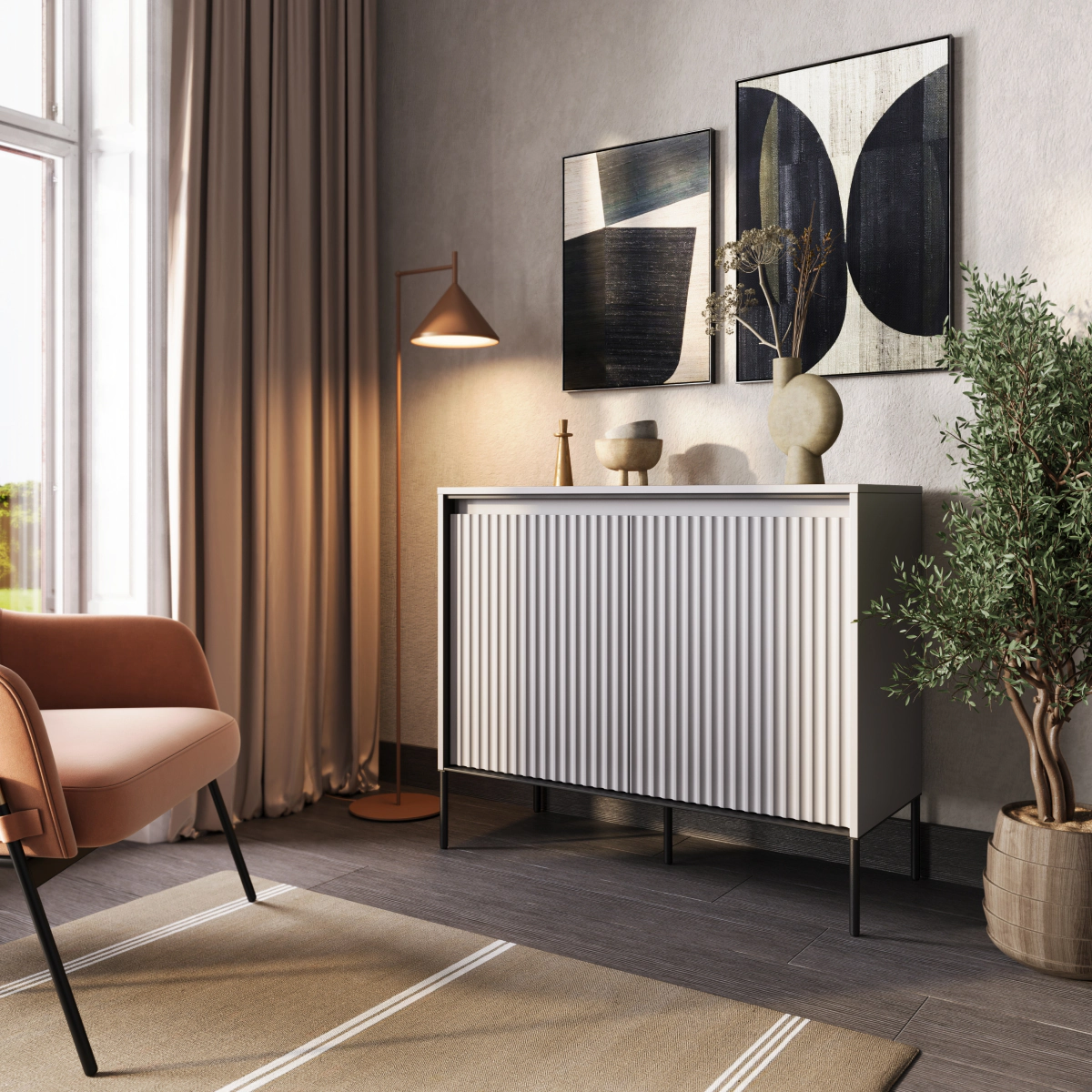 קומודה הקטנה TREND מציגה סגנון מינימליסטי מודרני, צבעים אופנתיים ונצחיים וחריצים עיצוביים.