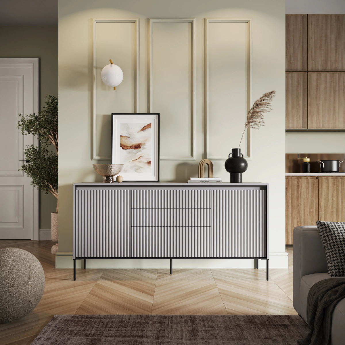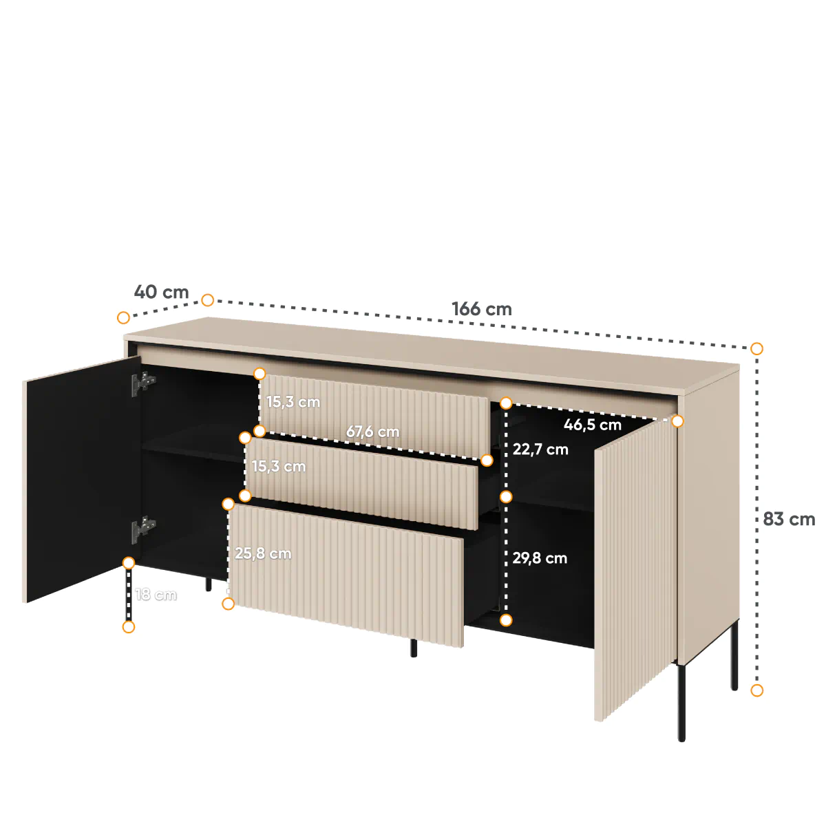 אחד האלמנטים המושכים את העין הם החריצים האלגנטיים בחזית המודגשים על ידי תאורת led. דפוס ייחודי זה מעניק לרהיטים אופי ייחודי, ומעניק לו מראה אטרקטיבי ומקורי.