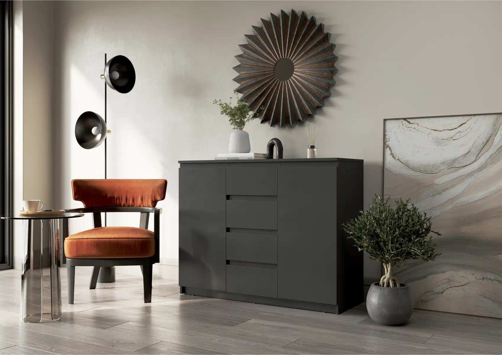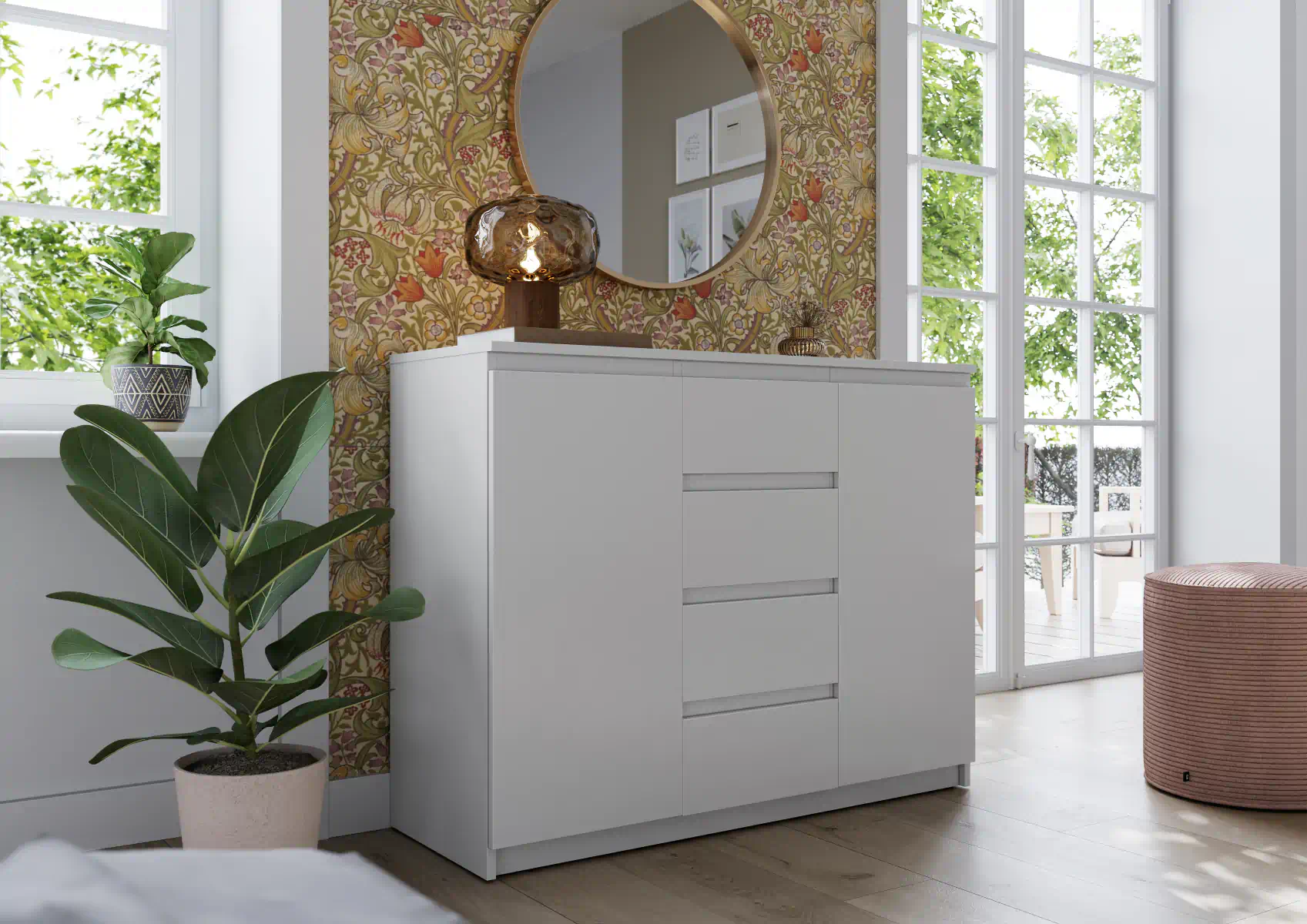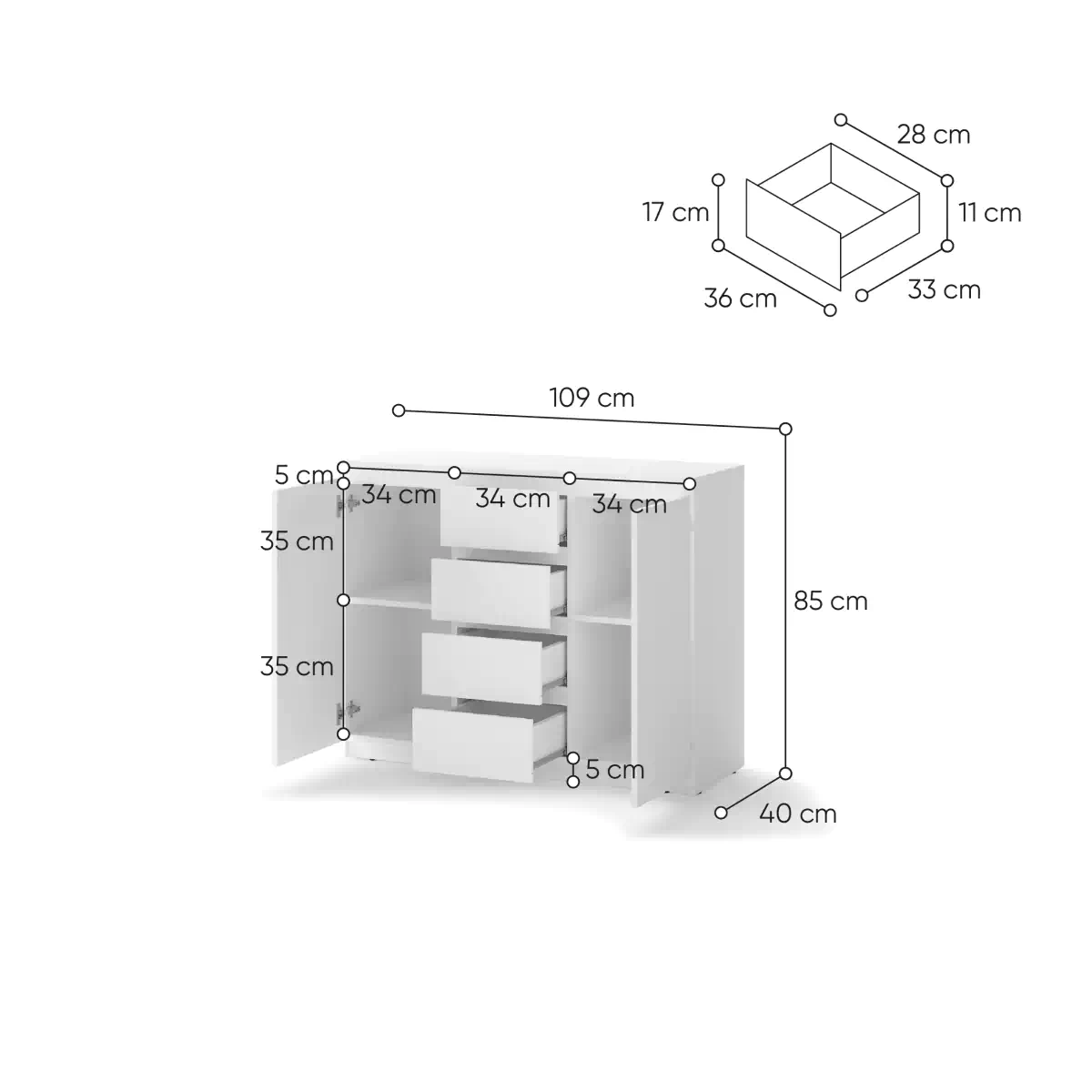 שילוב אחסון מרווח מאוד עם שתי דלתות וארבע מגירות, המספק שפע של מקום אחסון.