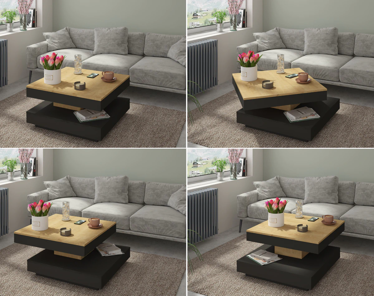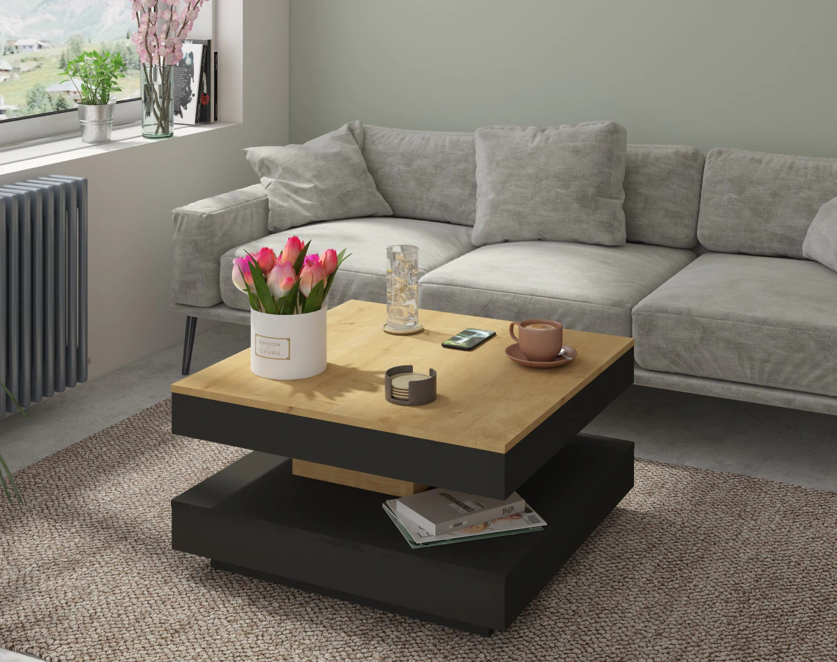 שולחן סלון Soho (78×78 ס”מ) עם משטח עליון מסתובב. עשוי משבבית עץ ומצופה במלמין איכותי.