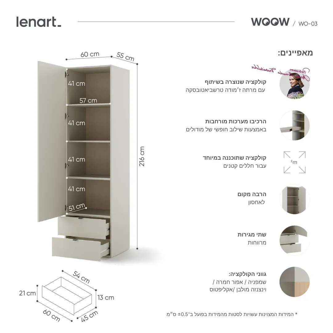 ארון חד-דלתי לחדר נוער בעיצוב מודרני וקומפקטי, עם 4 מדפים ו־2 מגירות עמוקות. פתרון אחסון חכם המשתלב בקלות עם רהיטים נוספים מסדרת WOOW.