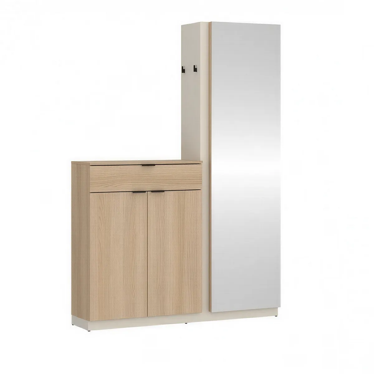 המוקד המרכזי של הרכב הריהוט הוא מראה גבוהה, שמרחיבה מיד את התחושה החזותית של החלל ומוסיפה אור טבעי – במיוחד בחדרי כניסה ללא חלונות. מאחורי דלתות כפולות מסתתרות מדפים נוחים, לאחסון נעליים, תיקים או קופסאות אביזרים, בעוד שהמגירה הפרקטית עוזרת לארגן פריטים קטנים שלרוב נעלמים רגע לפני היציאה מהבית.