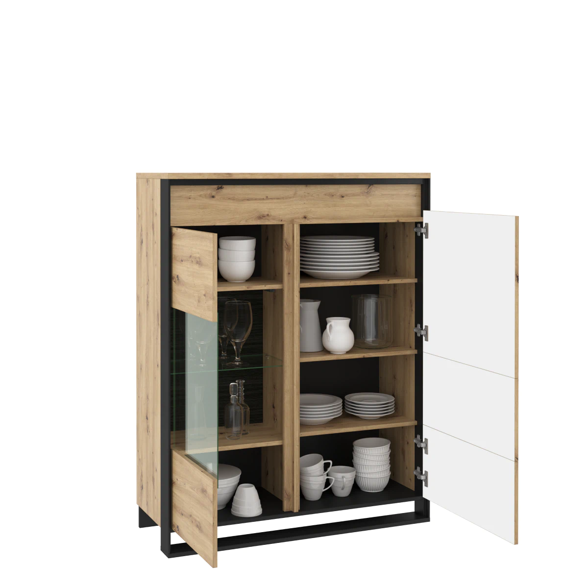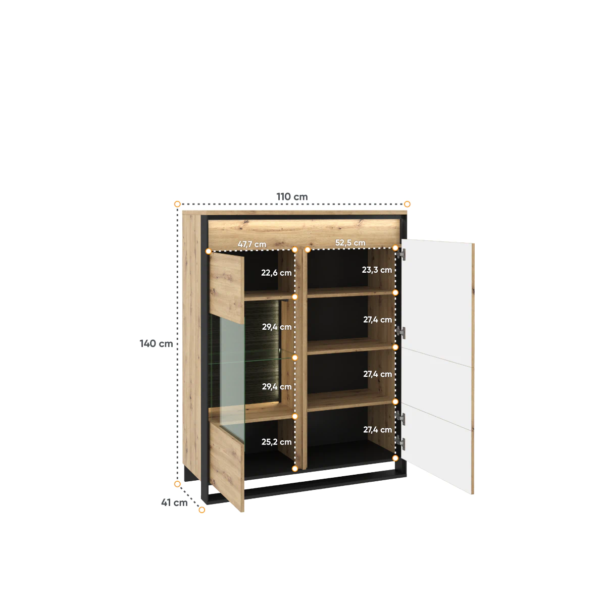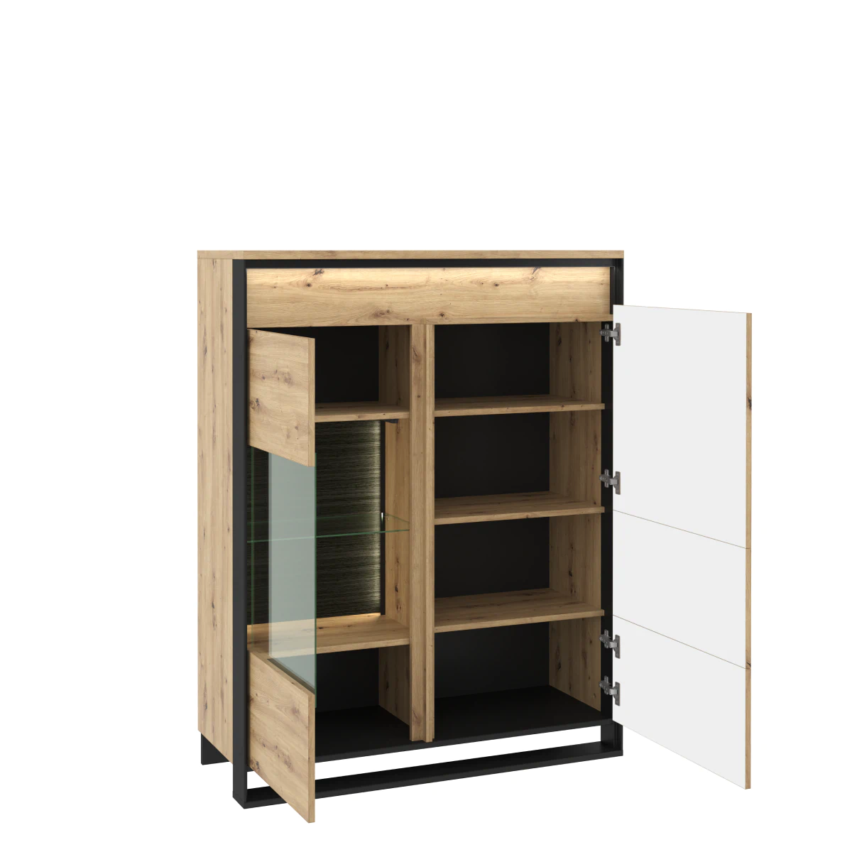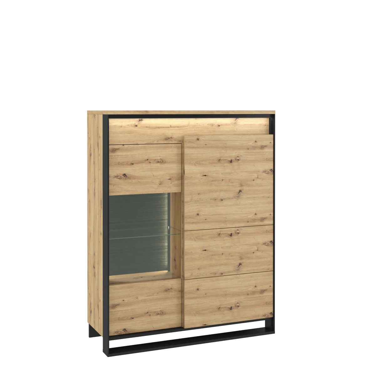 ויטרינה נמוכה בסגנון מודרני ולופטי. החלוקה הפונקציונלית של הפנים מאפשרת לאחסן חלק מהפריטים ולהציג אחרים בצורה מעניינת. בחלק הימני של הרהיט תמצא ארון סגור עם מדפים. החלק השמאלי מחולק לאזור עם זיגוג ולחלק עם דלתות ומדפים פנימיים.