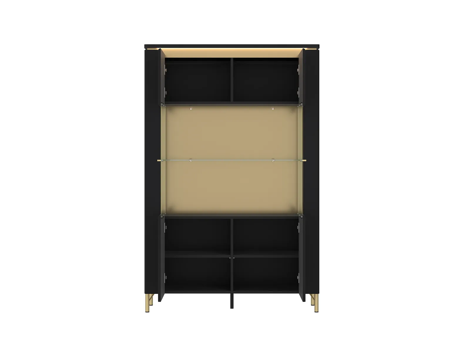 ויטרינה דו-דלתית בעיצוב יוקרתי ואלגנטי, בגימור שחור מאט עם נגיעות זהב ותאורת לד דקורטיבית — שילוב מושלם של סטייל ופרקטיקה לחלל מודרני ומרשים.