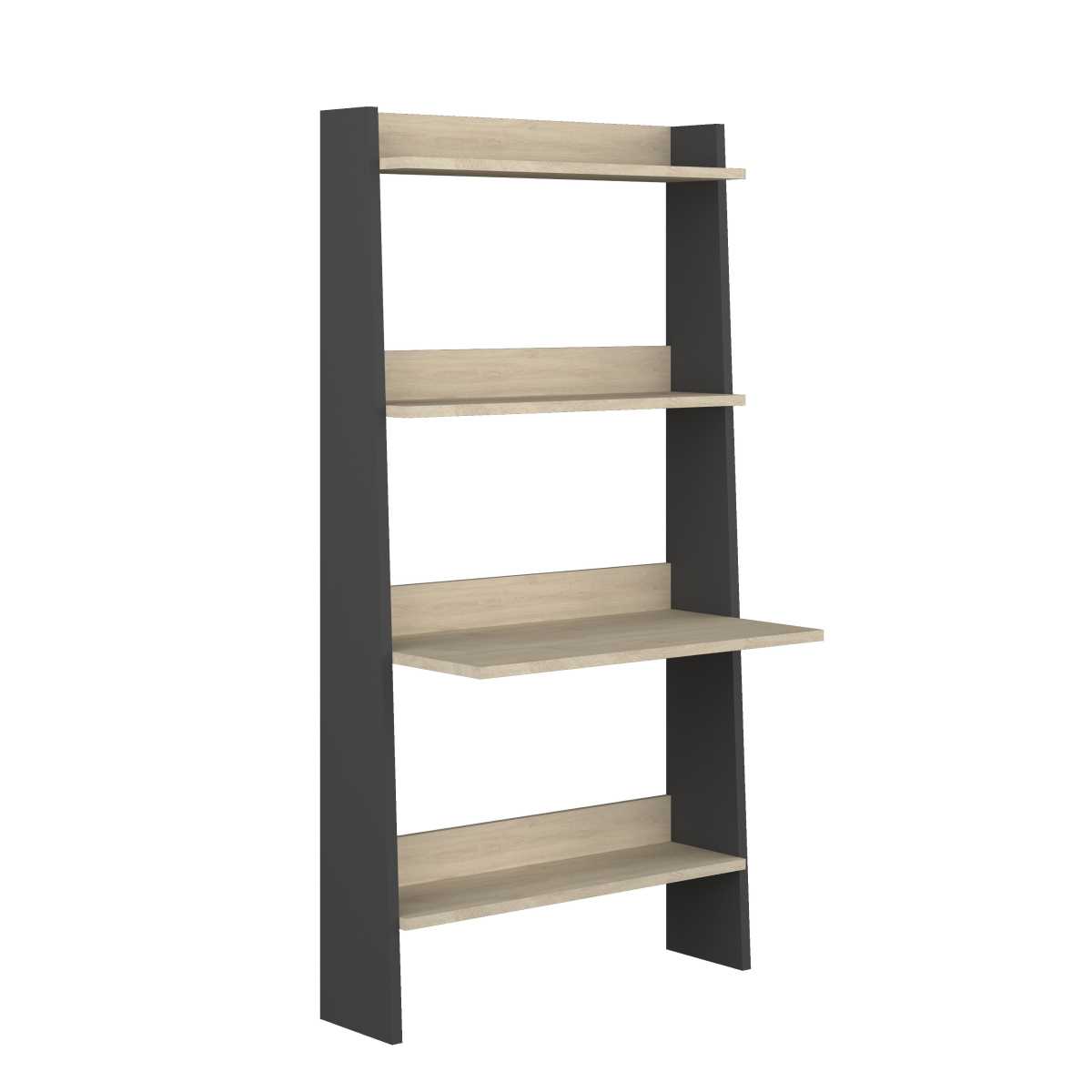כוננית ספרים סקריפט עם שולחן עבודה משולב, מצוידת ב-3 מדפים. עשויה מלוח סיבית בגימור דקור אלון עם פרטים אפורים.