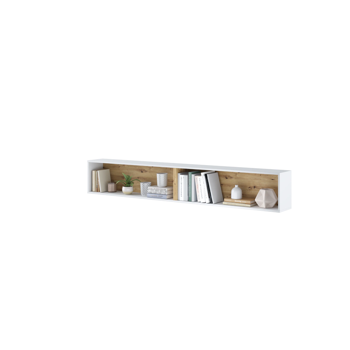 מדף מלבני מעוצב עם מחיצה לאחסון ותצוגה של צמחים, ספרים וחפצי נוי.