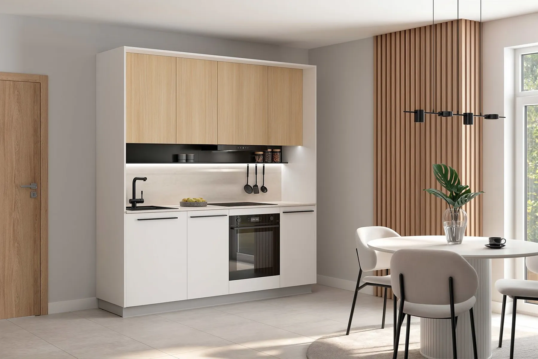 ערכת גימור תואמת הכוללת פאנלים צדדיים ועליונים בגוון לבן אלפיני, לסגירה אסתטית של המטבח משלושה צדדים ולמראה שלם ומעודכן.