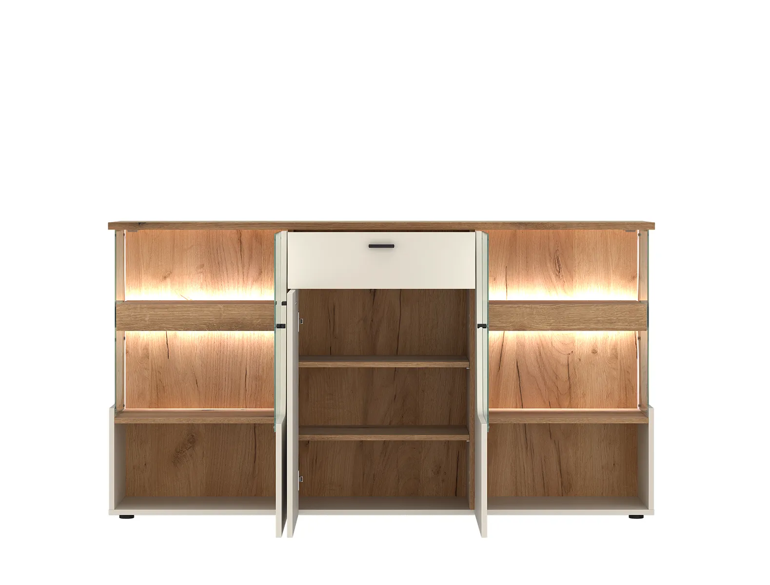 קומוד ייחודי בעיצוב עכשווי בגוון עץ אלון וקשמיר בהיר, המשלב בין מראה אלגנטי ופונקציונליות יומיומית. שני צידי הקומוד כוללים מדפי זכוכית עם תאורת LED פנימית, להבלטת פריטים אהובים ויצירת אווירה חמימה.