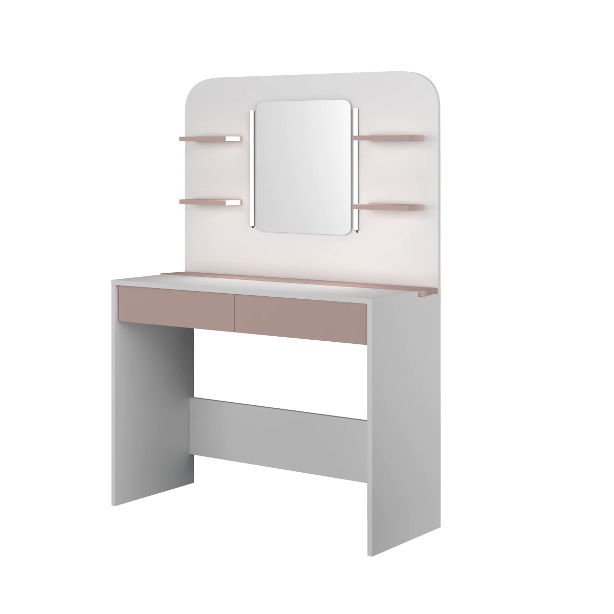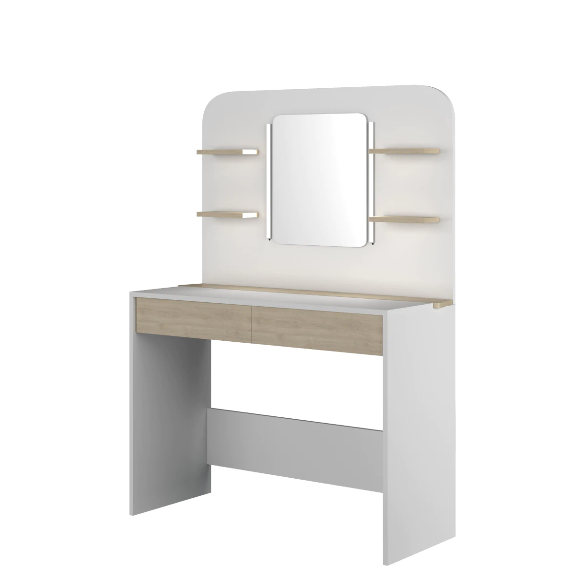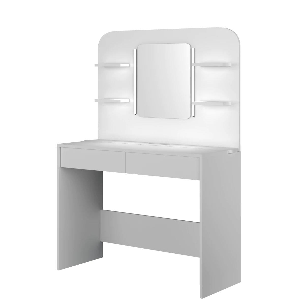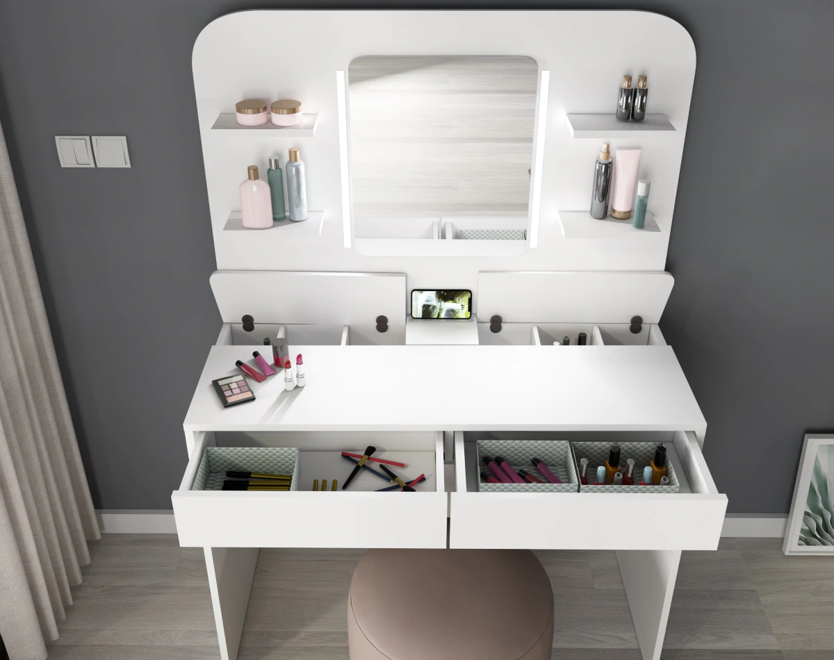 לשולחן איפור זה יתרונות רבים: מראה גדולה, תאורה מובנית, 4 מדפים קטנים (מקסימום 2 ק"ג), 2 מגירות ותאי אחסון מובנים מלמעלה.