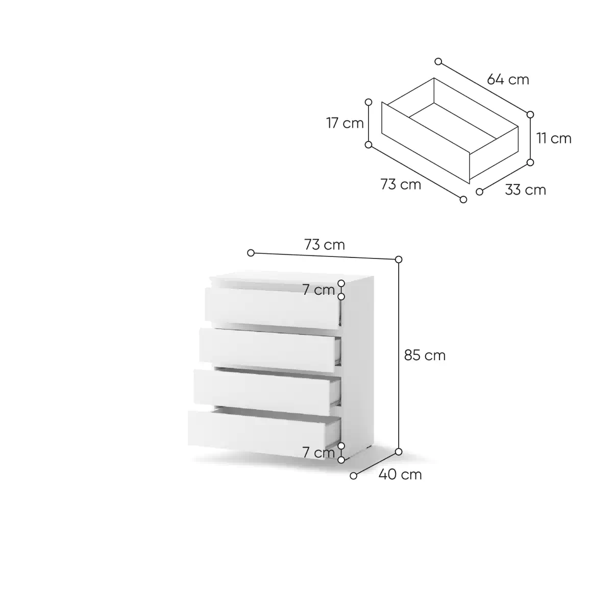 שידת ארבע מגירות מרווחת מאוד, המספקת שפע של מקום אחסון. מושלמת לחדר שינה, מסדרון, חדר הלבשה או לחדר נוער.